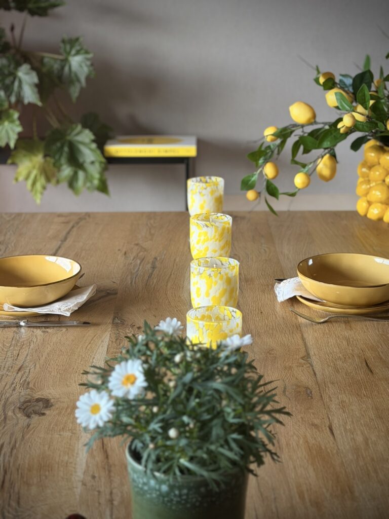 De collectie opent met speelse wijnglas-kaarsen in geel en wit, gevuld met de verkwikkende geur van citronella. Perfect voor buiten: sfeervol licht én een frisse, functionele touch tijdens warme zomeravonden.