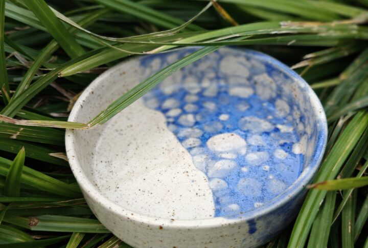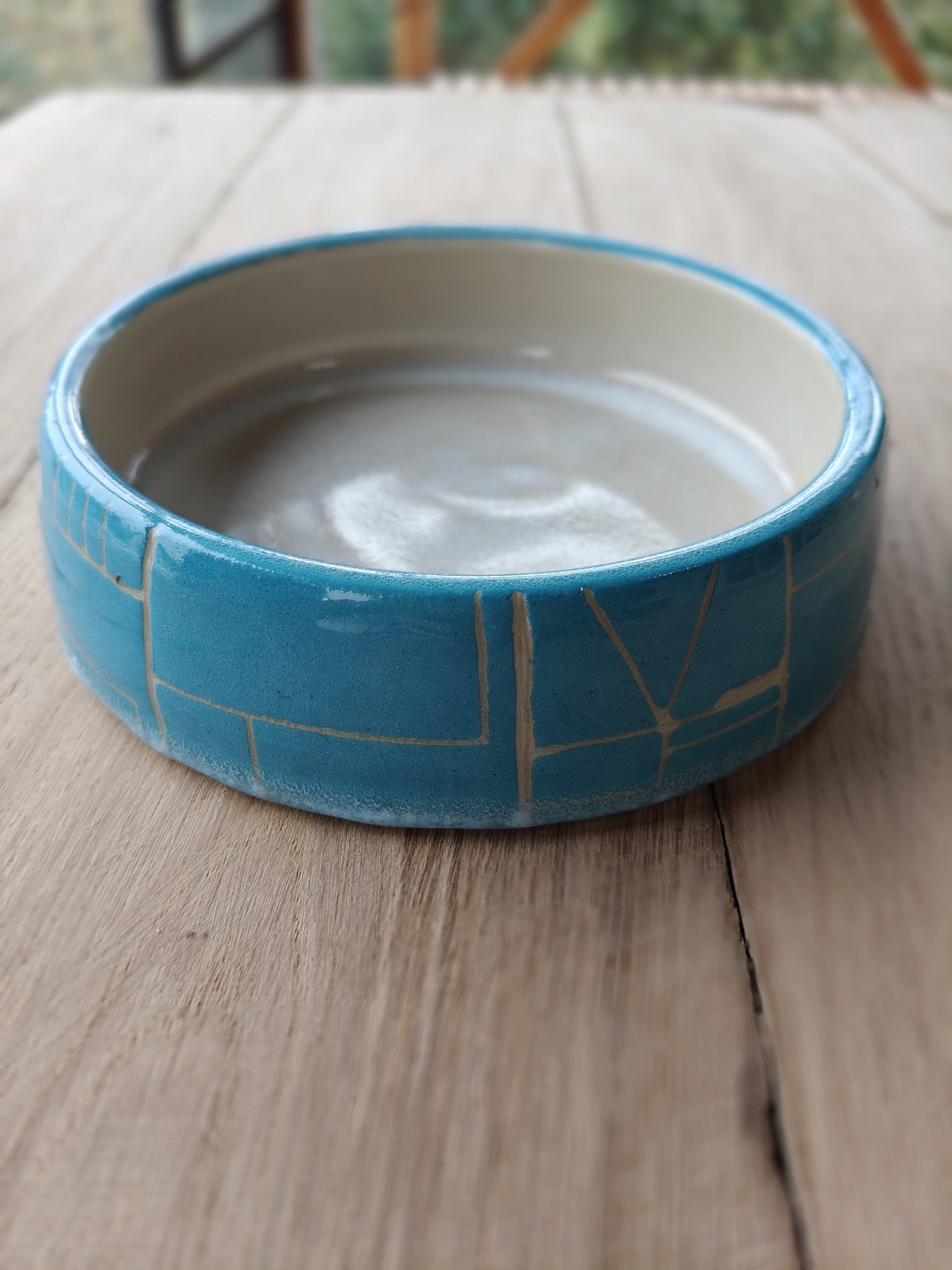 Een handgemaakte kom met uitgesneden patronen in het glazuur. Elke lijn is met de hand aangebracht, waardoor geen enkele voer- of drinkbak hetzelfde is. Stoer en verfijnd tegelijk – een kom met karakter én stijl.